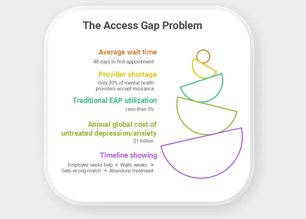 For decades, employers relied on Employee Assistance Programs (EAPs) as their mental health solution. Yet traditional EAPs suffer from dismally low utilization rates—often below 5%—and provide limited sessions that rarely address underlying issues. The question facing forward-thinking organizations wasn’t whether to invest in mental health, but how to invest in solutions that actually work.