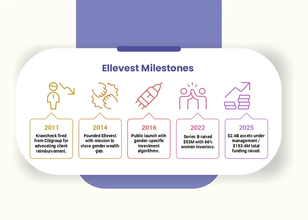 The Results: By 2025, Ellevest managed $2.4 billion in assets and raised $153.4 million. The 2022 Series B was remarkable: two-thirds of investors were women. In an industry where female-led companies receive less than 2% of VC funding, Ellevest attracted a majority-female investor base.
