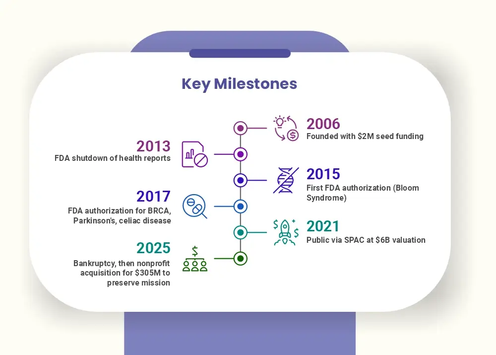 From Public to Mission-Driven: 23andMe went public in 2021 at a $6 billion valuation. By 2024, financial difficulties led to bankruptcy filing in March 2025. In June 2025, Wojcicki bought back 23andMe through her nonprofit for $305 million, refusing to let the database be liquidated or the mission abandoned.