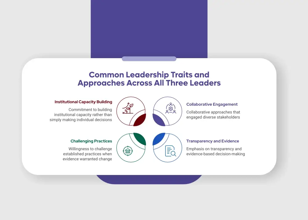 Their leadership styles shared common elements: collaborative approaches that engaged diverse stakeholders, emphasis on transparency and evidence-based decision-making, willingness to challenge established practices when evidence warranted change, and commitment to building institutional capacity rather than simply making individual decisions.